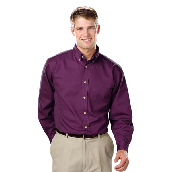 This men's long-sleeve 6.5 oz. colorfast shirt is a sure-fire way to satisfy a thrill for twill! Made of 100% cotton, this stylish shirt is washed and preshrunk for extra comfort. It features a button-down collar, a double-back yoke, two side back pleats, a patch pocket, adjustable cuffs and bone-horn buttons. This classic-fit item comes in most colors and sizes (XS-8XL Talls LT-3XLT) except for colors Maize, Sangria, Violet, Grape, Mango, Pink and Chocolate which are only available in Regular sizes.