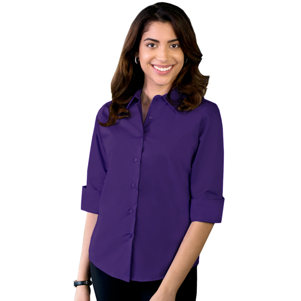 This wow-worthy wearable is no stretch! Made of a 58% cotton/39% polyester/3% spandex blend, this ladies stretch 3/4 sleeve poplin blouse is a versatile and eye-catching addition to any wardrobe. It features turn-up cuffs, wrinkle-resistant technology, a spread collar, curbed side panels for a slimmer fitted feminine look, a soft-touch finish, a double-back yoke and pearlized buttons. Available in several colors and in sizes from XS to 4XL, this stylish shirt will turn heads! Discontinued Color(s): Violet