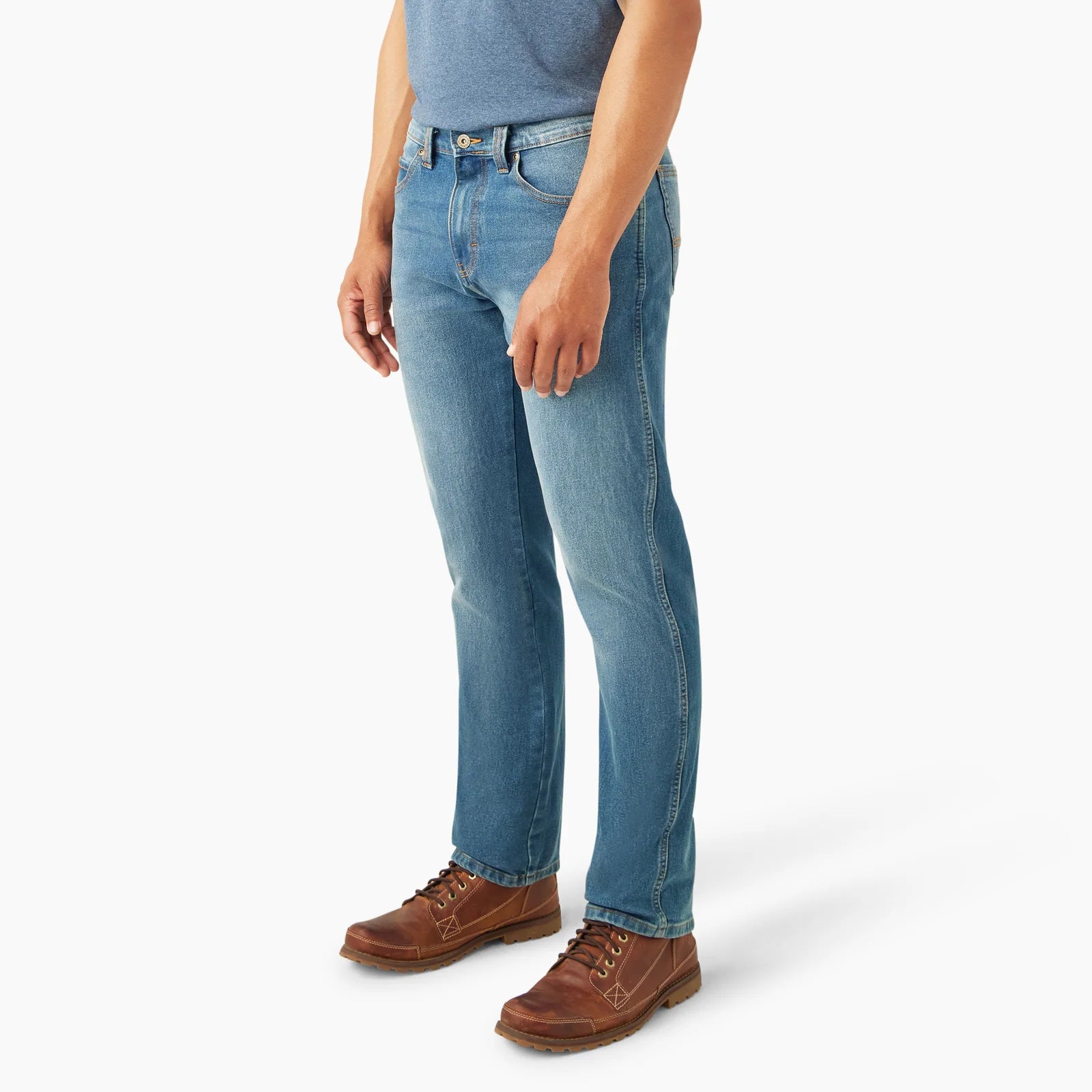 - Timeless denim crafted to last. These men's jeans have a slim fit and are built from a cotton-blend denim with enough stretch for all-day comfort and mobility. They're reinforced with double needle stitching throughout for a durable work essential you can trust.