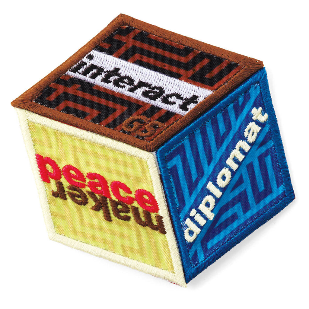 Girl Scout Cadette Journey Award Set is iron-on with three embroidered appliques: Interact, Diplomat and Peacemaker fit together to form cube shape design. Imported.