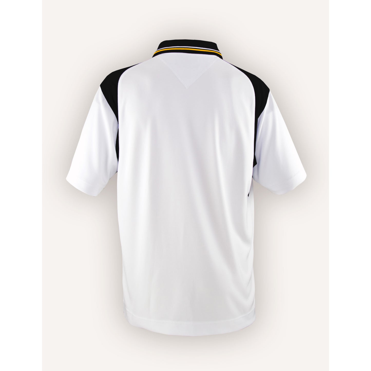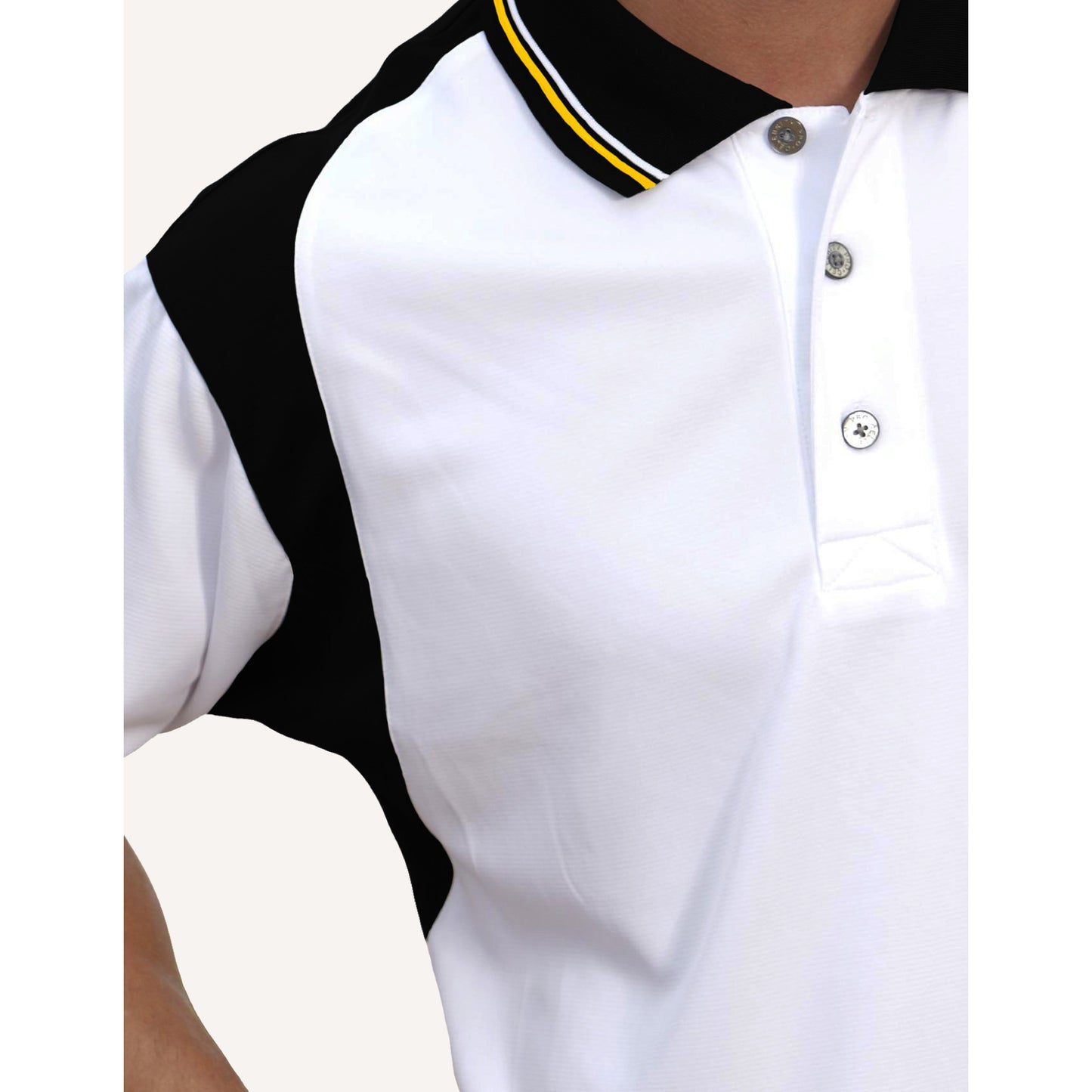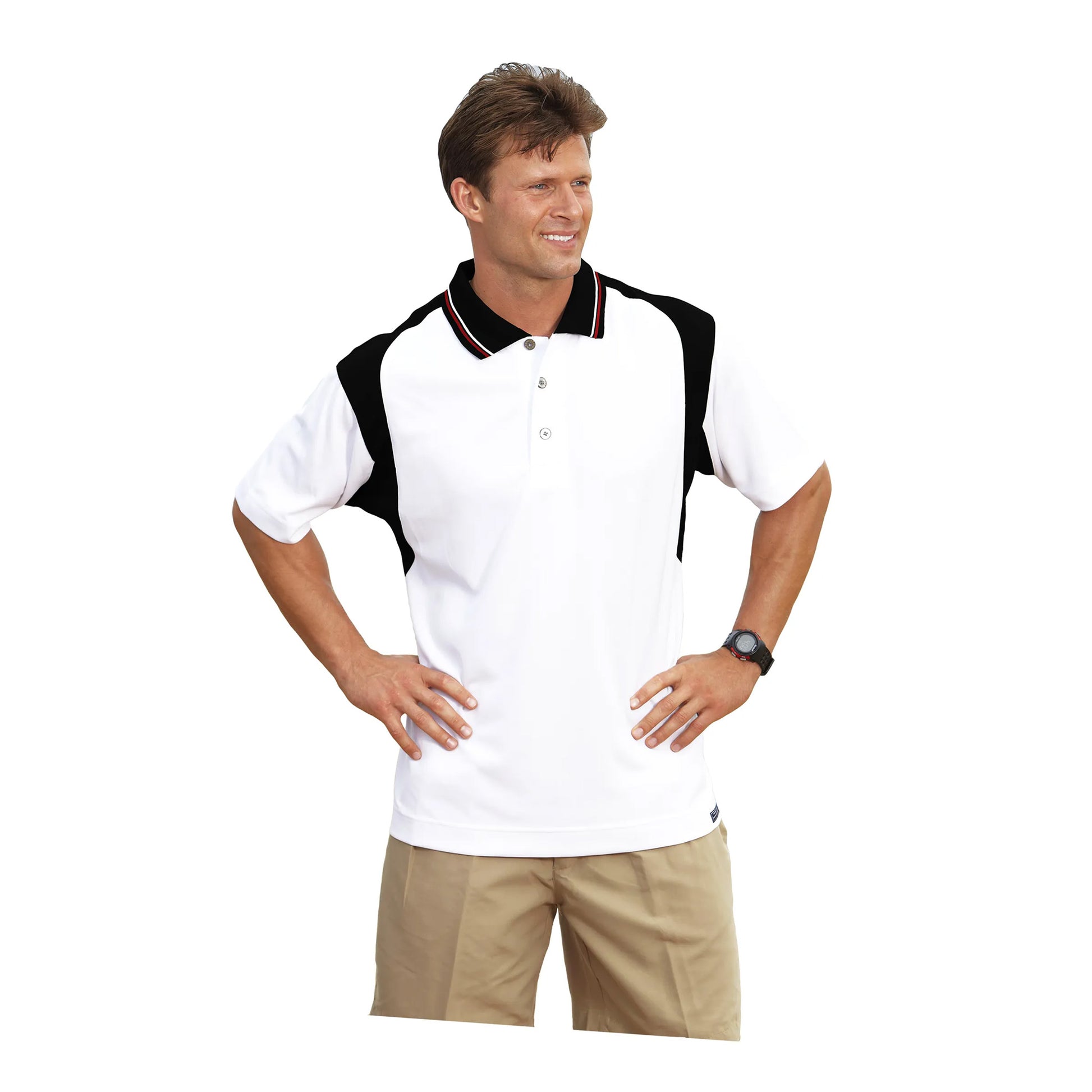 - The white-bodied polo uses accent color block insert design extending around the shoulder & top of sleeve
